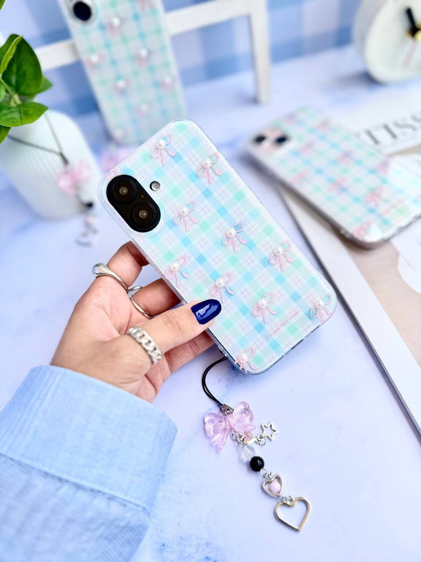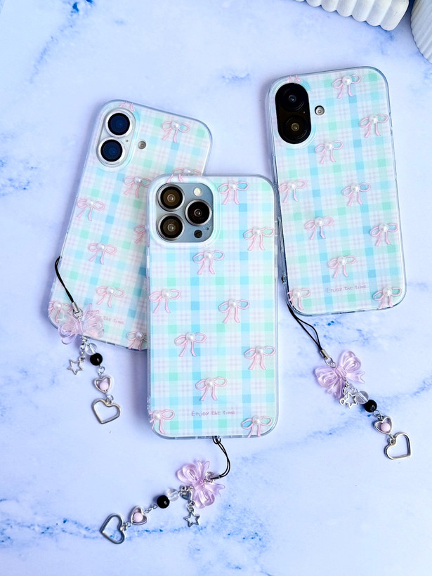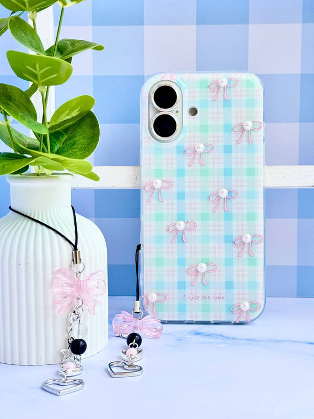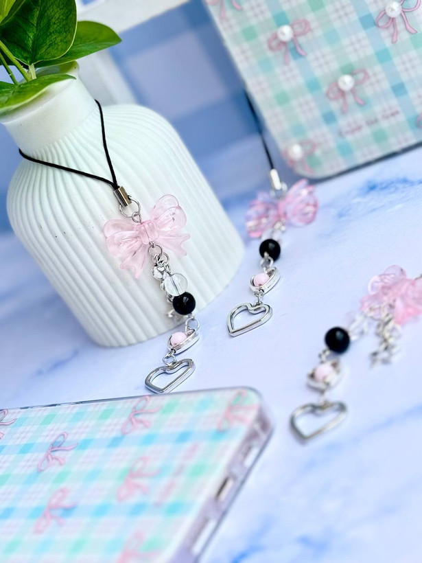 کاور گوشی مدل Pink Seoul با آویز پاپیون شیشه ای مروارید های روی قاب برجسته (فقط آیفون) کد C2031-M