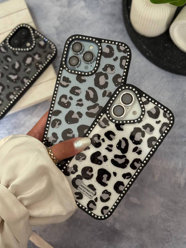 کاور گوشی مدل پلنگی نگین دار پشت طلقی زمینه شاینی اکلیلی نگین در دو سمت قاب (آیفون ) کدC2104M